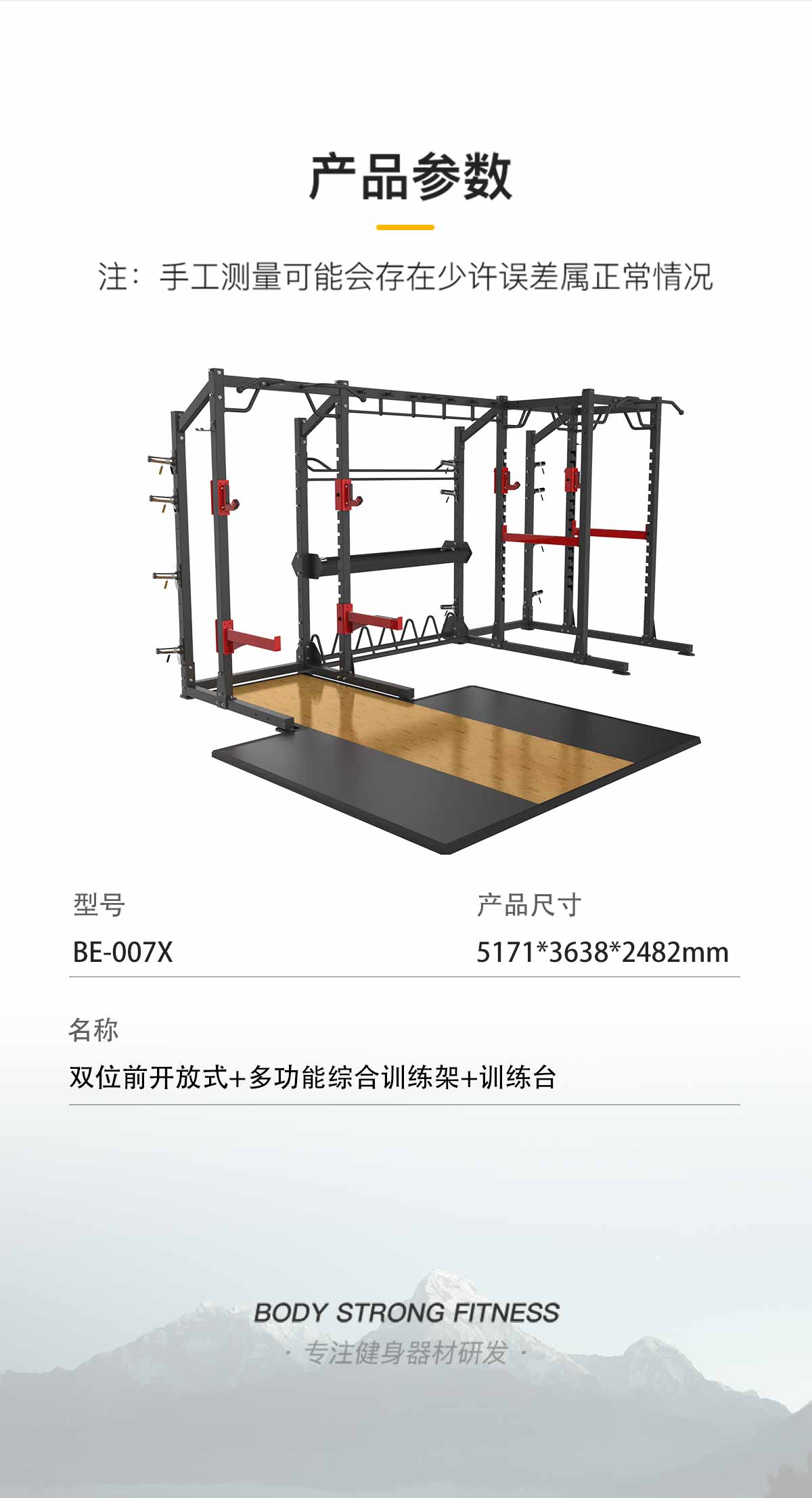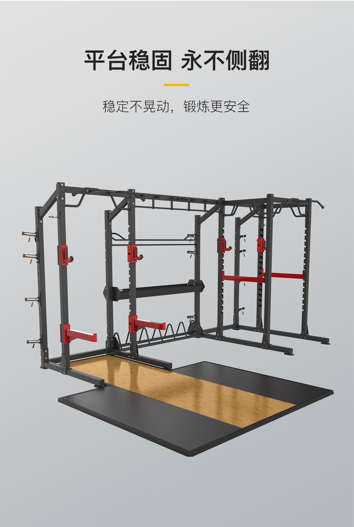 前开放式深蹲架功能模块+多功能深蹲架功能模块+独立单排收纳模块+多功能链接附件+球类储存链接附件+杠铃片储存链接附件+自由储存链接附件+前开放式深蹲训练台